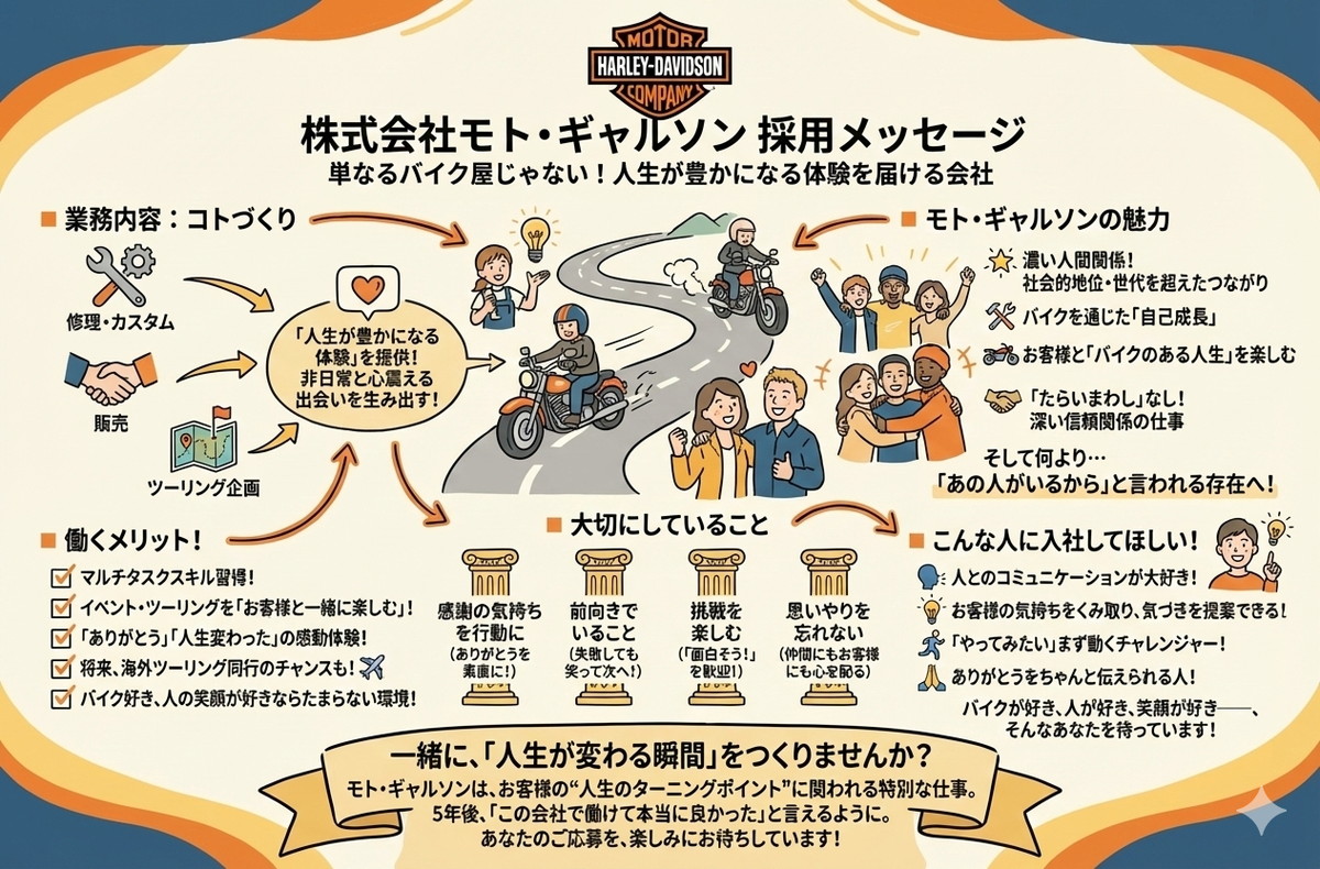 モト・ギャルソンで働くということは、ただの仕事ではありません。 お客様の“人生のターニングポイント”に関われる、特別な仕事です。5年後、あなたが「この会社で働けて、本当に良かった」と心から思えるように。私たちと一緒に「お客様の人生を豊かにする瞬間」を創りませんか?ご応募をお待ちしています。