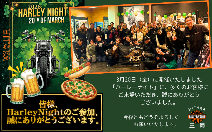 ハーレーダビッドソン三鷹は、「遊べるバイク屋」をモットーに、単なる正規販売店としてだけではなくハーレーライフの発信基地として多くのお客様に親しまれています。ディーラーオブザイヤーを3年連続受賞し、アジアパシフィックNo.1にも選ばれた当店では、初めてのハーレーにも安心して楽しくお乗り頂けるよう、温かく、感動を届けるサービスを心がけています。